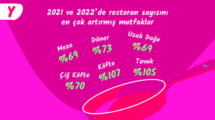 Restoran istatistikleri konusunda da Yemeksepeti verilerinde ilgi çekici detaylar ortaya çıktı. Geçen sene 6.700 adet olan döner restoranı sayısı bu sene 11.561'e çıktı. Yüzdesel olarak en büyük artış ise %106 ile köfte mutfağı restoranlarında yaşandı ve köfte satan restoran sayısı 2 katına çıktı. Tavuk döner restoran sayısında da geçen seneye oranla %104'lük bir artış söz konusu oldu.
