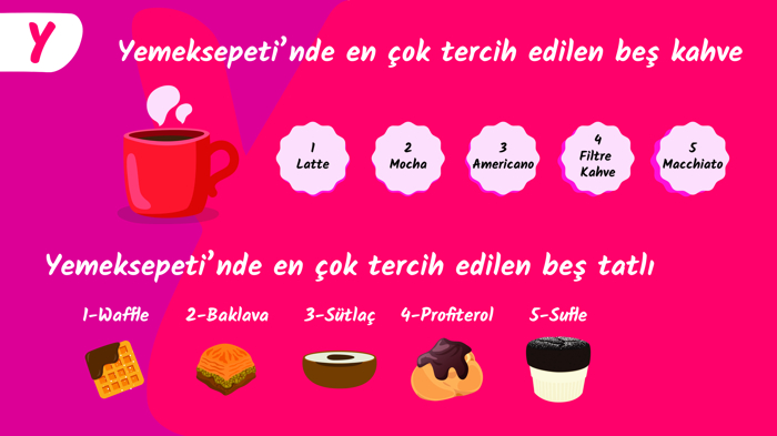 Yemeksepeti'nde tatlılar da bu sene çok yoğun ilgi gördü. En çok sipariş edilen tatlılar sıralaması Waffle, Baklava, Sütlaç, Profiterol, Sufle olarak şekillendi.