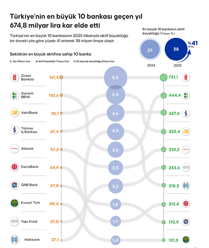 AA'nın bankaların konsolide olmayan finansal tablolarından derlediği bilgiye göre, 2025 yılında Ziraat Bankası, VakıfBank, Türkiye İş Bankası, Halkbank, Garanti BBVA, Akbank, Yapı Kredi, QNB Bank, Denizbank ve Kuveyt Türk ülkede en yüksek aktif büyüklüğe sahip bankalar olarak sıralandı.