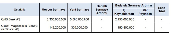 QNB Bank AŞ'nin 2 milyar 150 milyon liralık ve Gimat Mağazacılık Sanayi ve Ticaret AŞ'nin 150 milyon 800 bin liralık bedelsiz sermaye artırımı onaylandı.
