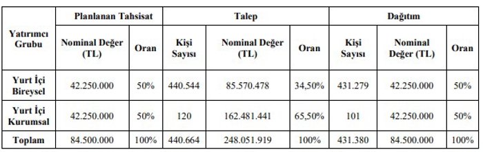 Halka arza ilişkin dağıtım tutarları ve talebi karşılanan başvuru sayısı, yatırımcı grubu bazında ekte yer almaktadır."