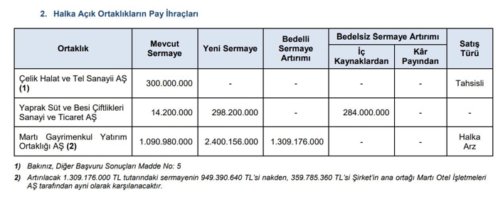 Çelik Halat ve Tel Sanayii AŞ'nin tahsisli, Yaprak Süt ve Besi Çiftlikleri Sanayi ve Ticaret AŞ'nin 284 milyon liralık bedelsiz, Martı Gayrimenkul Yatırım Ortaklığı AŞ'nin 1 milyar 309 milyon 176 bin liralık bedelli sermaye artırımı onaylandı.