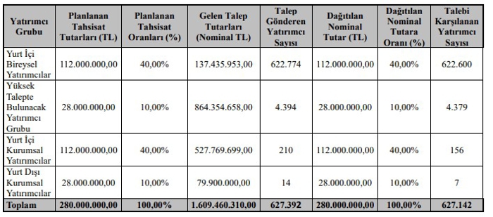 Dağıtıma esas tahsisat oranları ise yurt içi bireysel yatırımcılar için %40, yüksek talepte bulunacak yatırımcı grubu için %10, yurt içi kurumsal yatırımcılar için %40 ve yurt dışı kurumsal yatırımcılar için ise %10 olarak gerçekleşmiştir.