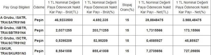 C Grubu için brüt 0,5395209 TL, net 0,4585927 TL nakit temettü dağıtılması genel kurul onayına sunulacak. Teklif şöyle: