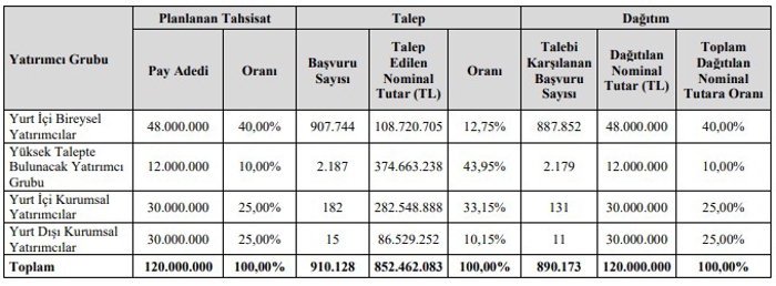 Dağıtıma esas tahsisat oranları ise yurt içi bireysel yatırımcılar için %40, yüksek talepte bulunacak yatırımcı grubu için %10, yurt içi kurumsal yatırımcılar için %25 ve yurt dışı kurumsal yatırımcılar için ise %25 olarak gerçekleşmiştir.