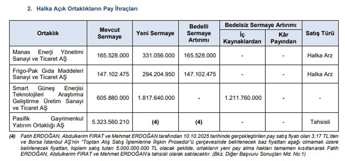 Kurul ayrıca halka açık ortaklıkların pay ihraçlarına ilişkin başvuruları da karara bağladı. Buna göre Manas Enerji Yönetimi Sanayi ve Ticaret AŞ ile Frigo-Pak Gıda Maddeleri Sanayi ve Ticaret AŞ'nin bedelli sermaye artırımı yoluyla pay ihracı onaylandı. Smart Güneş Enerjisi Teknolojileri Araştırma Geliştirme Üretim Sanayi ve Ticaret AŞ'nin ise iç kaynaklardan bedelsiz sermaye artırımı talebi uygun bulundu.