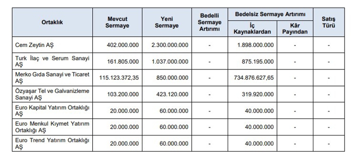 SPK haftalık bültenine göre, Kurul, Cem Zeytin AŞ'nin 1 milyar 898 milyon liralık, Turk İlaç ve Serum Sanayi AŞ'nin 875 milyon 195 bin liralık, Merko Gıda Sanayi ve Ticaret AŞ'nin 734 milyon 876 bin 627 liralık, Özyaşar Tel ve Galvanizleme Sanayi AŞ'nin 319 milyon 920 bin liralık, Euro Kapital Yatırım Ortaklığı AŞ'nin 40 milyon liralık, Euro Menkul Kıymet Yatırım Ortaklığı AŞ'nin 40 milyon liralık ve Euro Trend Yatırım Ortaklığı AŞ'nin 40 milyon liralık bedelsiz sermaye artırım talebini onayladı.