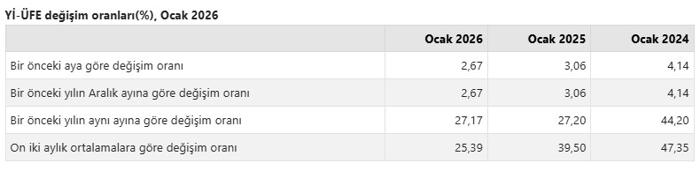Yİ-ÜFE 2026 yılı Ocak ayında bir önceki aya göre %2,67 artış, bir önceki yılın Aralık ayına göre %2,67 artış, bir önceki yılın aynı ayına göre %27,17 artış ve on iki aylık ortalamalara göre %25,39 artış gösterdi.