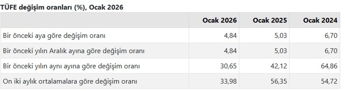 TÜİK, 2026 yılının ilk ayına ilişkin enflasyon verilerini açıkladı. Buna göre TÜFE bir önceki aya göre %4,84 , bir önceki yılın Aralık ayına göre %4,84 , bir önceki yılın aynı ayına göre %30,65 arttı ve on iki aylık ortalamalara göre %33,98 artış olarak gerçekleşti.