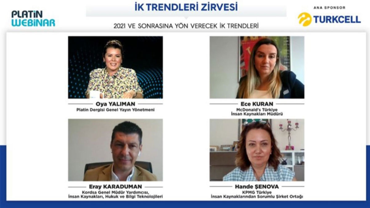 Platin Dergisi'nin Turkcell ana sponsorluğunda gerçekleştirdiği İK Trendleri Zirvesi'ne; Turkcell İnsan Kaynakları Mükemmeliyet Merkezi Direktörü Seray Kerimak, Mc Donald's Türkiye İnsan Kaynakları Müdürü Ece Kuran, Kordsa Genel Müdür Yardımcısı Eray Karaduman ve KPMG Türkiye İnsan Kaynaklarından Sorumlu Şirket Ortağı Hande Şenova katıldı.