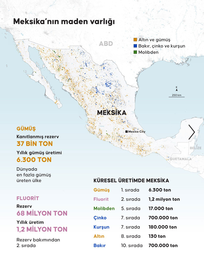 Meksika, dünyada en fazla gümüş üreten ülke konumunda bulunuyor. Ülke, birçok madenin rezervinde listenin ilk sıralarında yer alıyor.