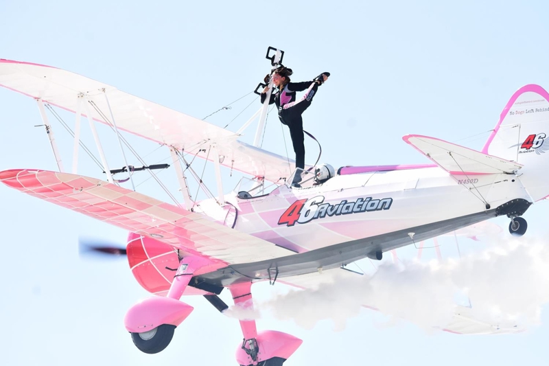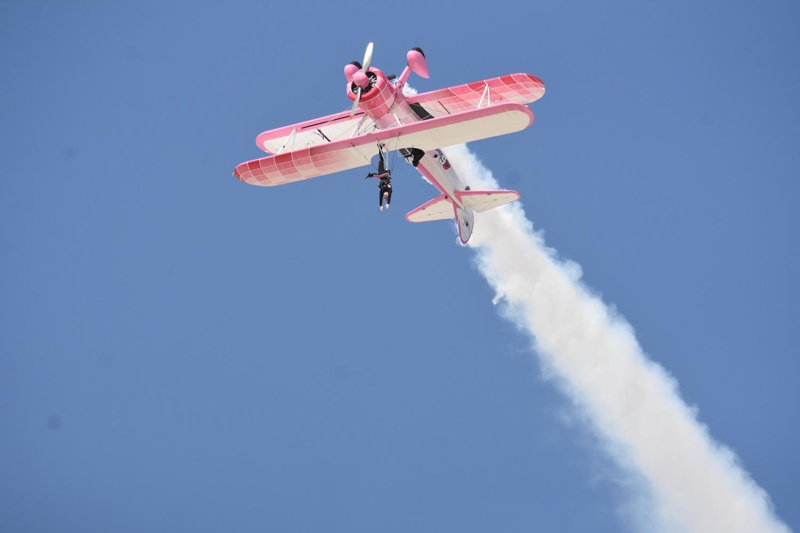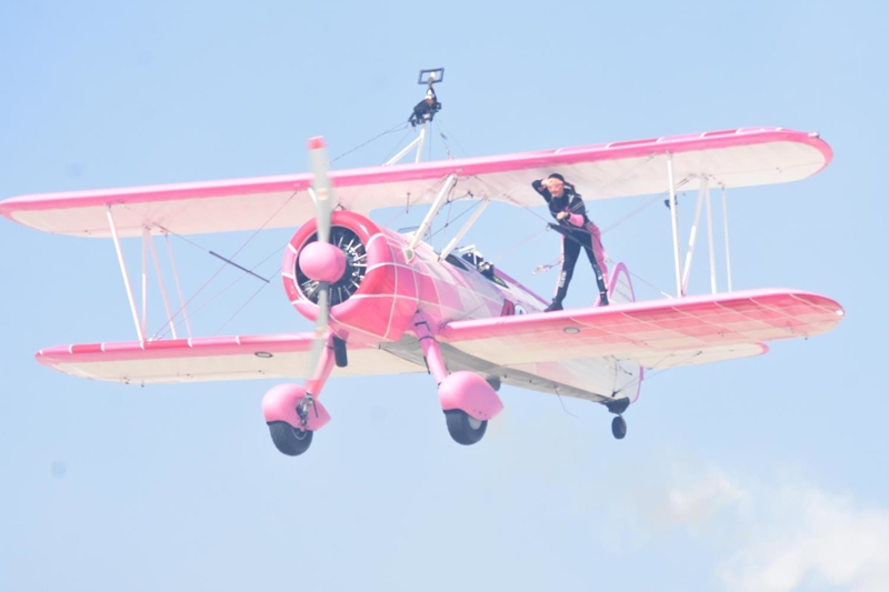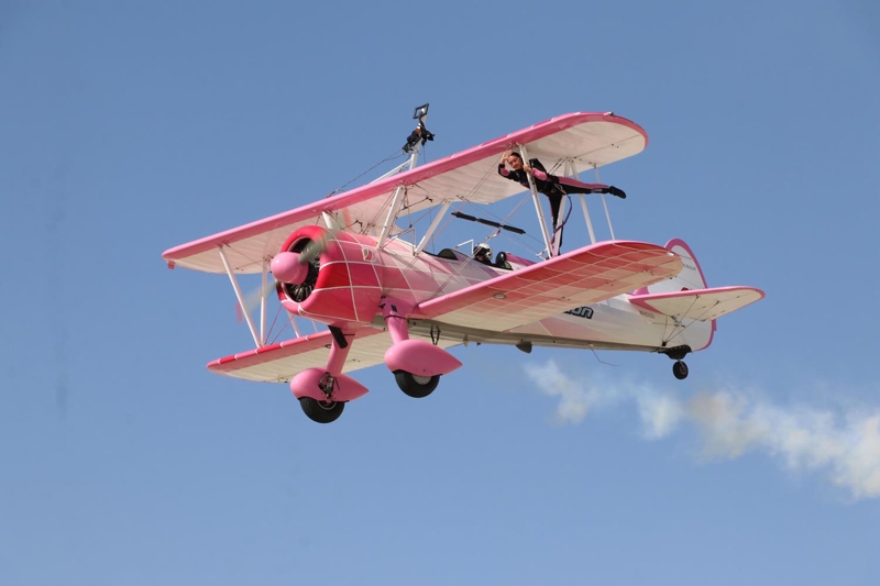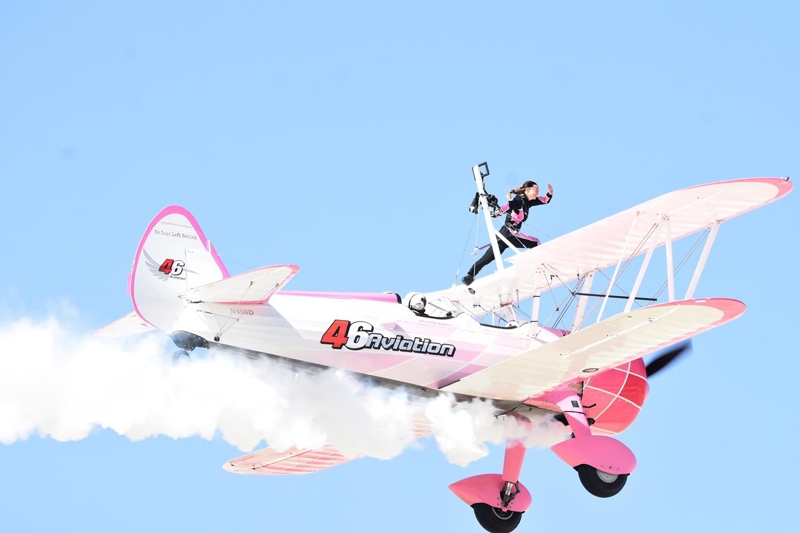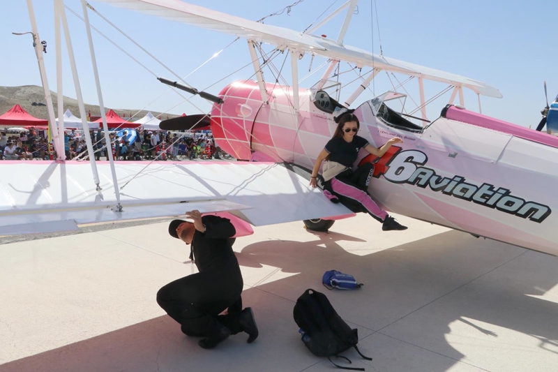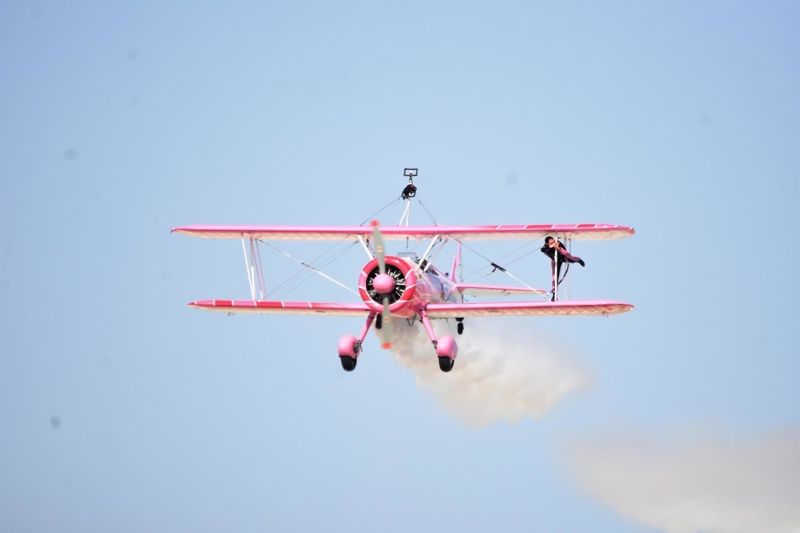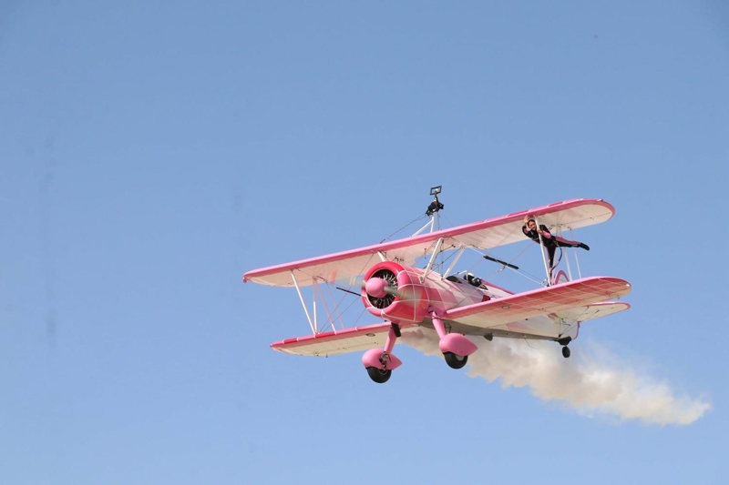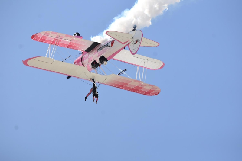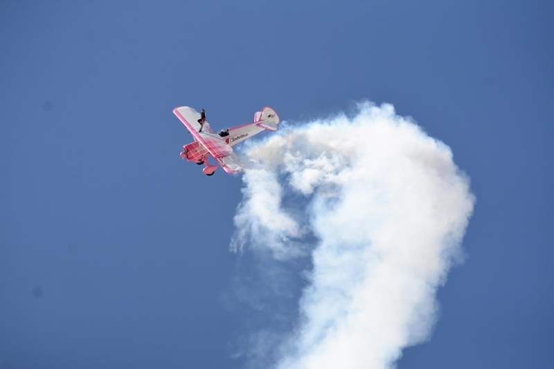 Bazı manevralarda özel bir aparatla kendini uçağın üzerine sabitleyen Danielle Del Buono'nun uçağın kanadının üzerinde ve kanatlar arasında sunduğu gösteri izleyenleri heyecanlandırdı.