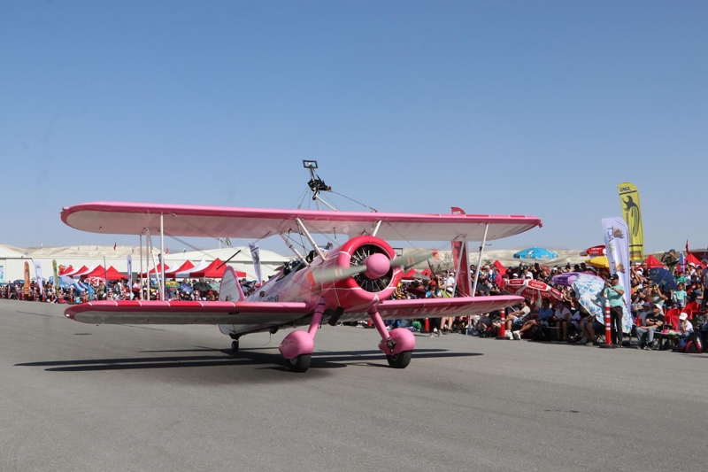 Del Buono çifti, Eskişehir'in Sivrihisar ilçesinde bu yıl 7'ncisi gerçekleştirilen "Sivrihisar Hava Gösterileri 2022"de pembe renkli uçaklarıyla gösteri sundu.