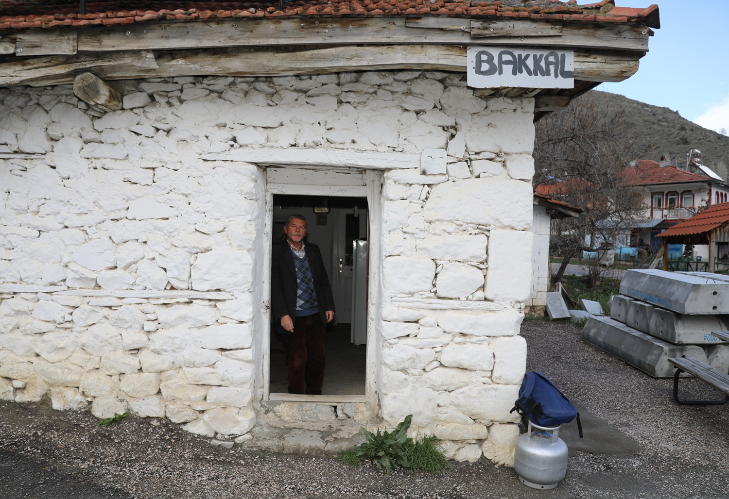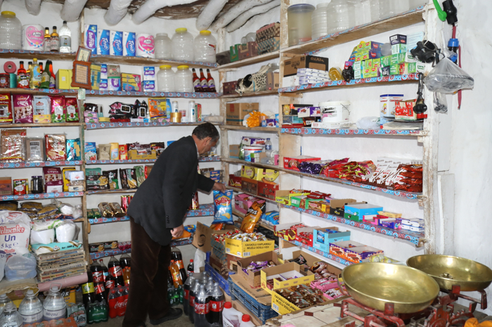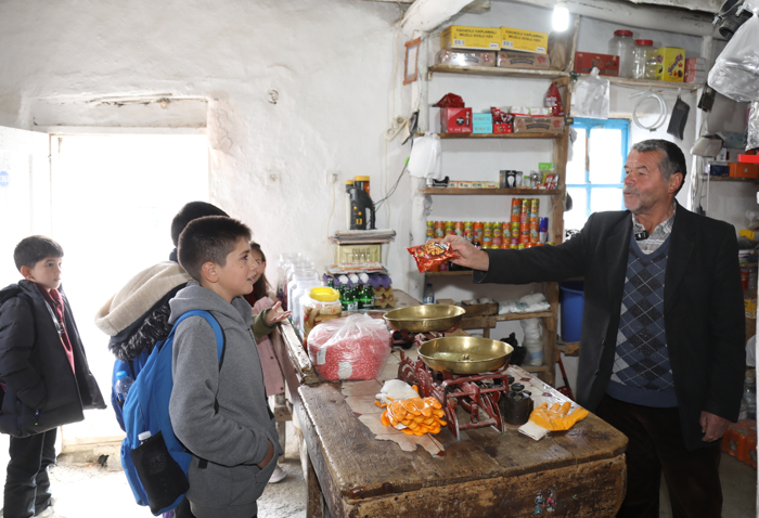 Taş ve kerpiç duvarları, ahşap tavanı ve eski terazileriyle dikkati çeken bakkal, 1930'lu yılların izlerini taşırken, beyaza boyalı dış cephesiyle de ilgi görüyor.