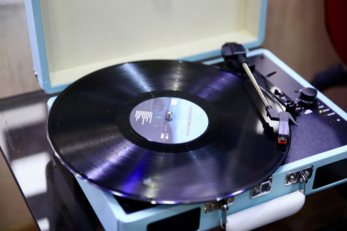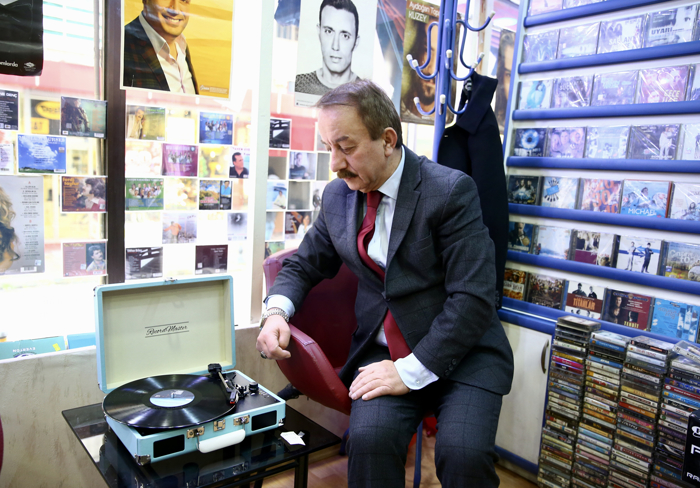 Aydın'ın iş yerinde 1980'li yıllardan yakın tarihe kadar 1500'ün üzerinde kaset ile nostalji şarkılar içeren plak yer alıyor.