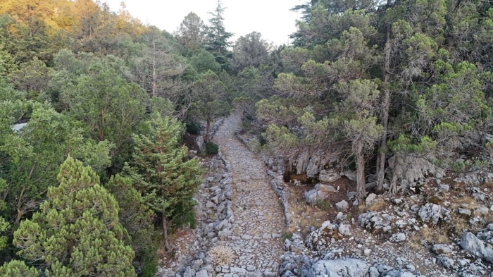 Antalya'nın Akseki ilçesinde, Roma döneminden Osmanlı'ya kadar kesintisiz kullanılan Akseki-Sarıhacılar Kervan Yolu, havadan böyle görülüyor. Akseki'den başlayıp Sarıhacılar Mahallesi'ne kadar uzanan 3 bin 650 metrelik taş döşeli tarihi yol, görenleri büyülüyor. Fotoğraf: İHA (2025)
