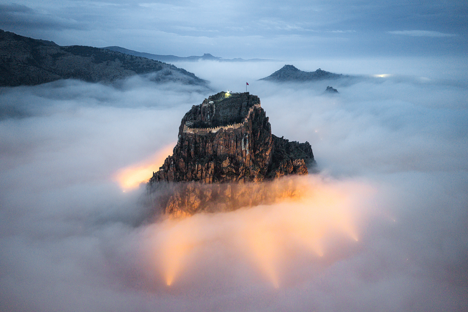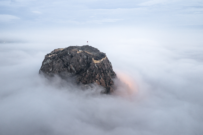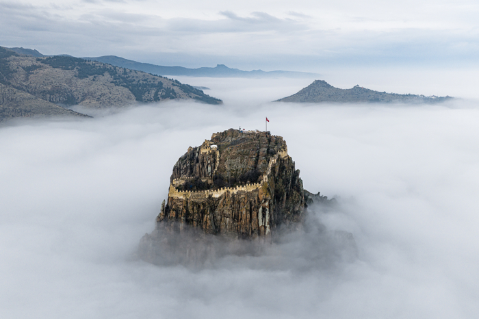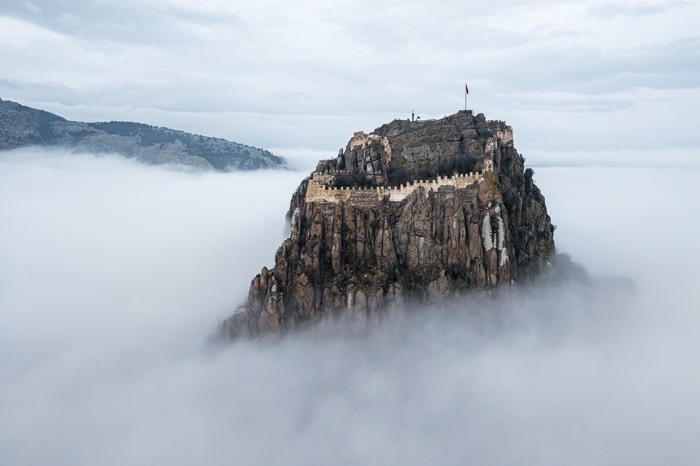 Afyonkarahisar'da kentin simgelerinden biri olan Afyonkarahisar Kalesi, sabahın erken saatlerinde oluşan sis ile görüntülendi.