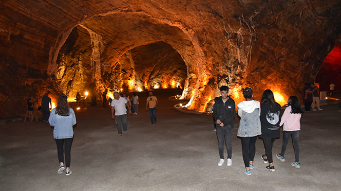 Ziyaretçiler, Tuz Dağı'nda, bölgenin tuz ihtiyacının karşılanması maksadıyla yapılan kazı çalışmaları sonucu açılan galerileri gezebiliyor.