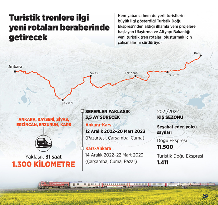 Turistik Doğu Ekspresi'nin yeni dönem seyahat takvimi de hazırlandı. Ankara'dan 12 Aralık 2022-20 Mart 2023, Kars'tan 14 Aralık 2022-22 Mart 2023 dönemlerinde seferler yapılacak. Tren Ankara'dan pazartesi, çarşamba, cuma, Kars'tan ise çarşamba, cuma ve pazar günleri hareket edecek.