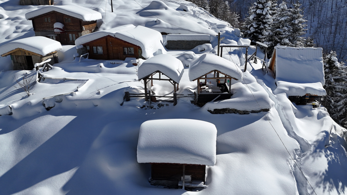 Kar altındaki Ayder Yaylası'nda oluşan manzaralar dronla kaydedildi.