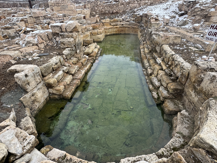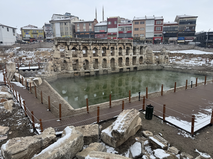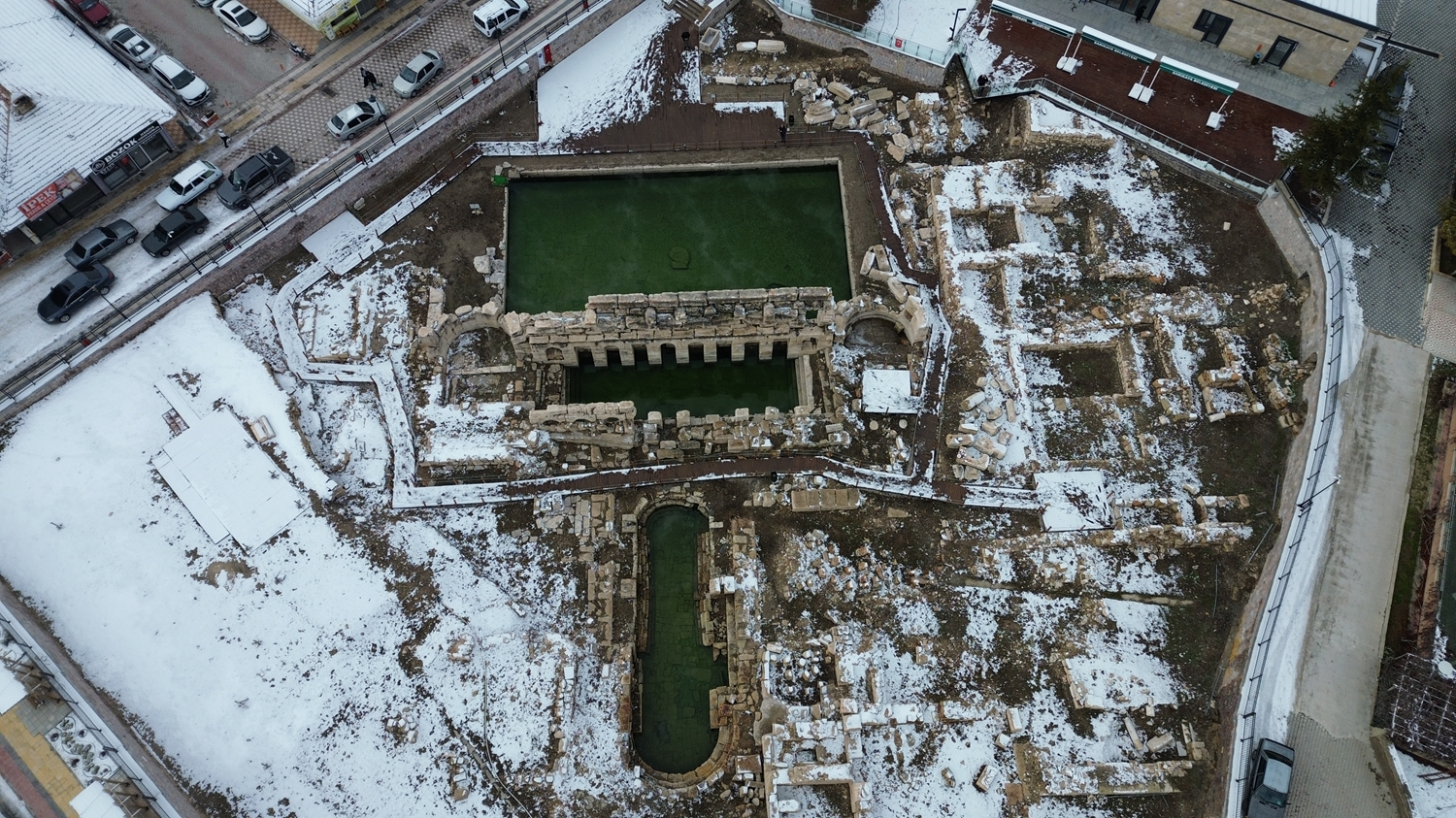 Yozgat Müze Müdürlüğü gözetiminde 2022'de başlatılan ve Ağustos 2024'te tamamlanan çevre düzenleme çalışmalarının ardından ziyaretçilerini ağırlayan hamamda, son günlerde etkisini gösteren soğuk hava ve kar yağışının ardından güzel görüntüler oluştu.