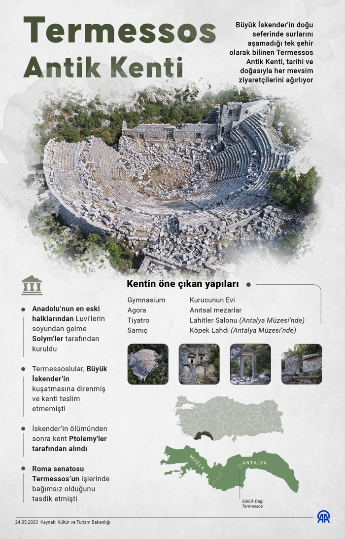 Antalya'nın Döşemealtı ilçesi yakınlarındaki antik kent, nekropol alanları, lahitleri, yapıları, tiyatrosu, yaban hayatı ve endemik bitkileriyle dikkati çekiyor. Güçlü savunmasıyla "Büyük İskender'in işgal edemediği şehir" olarak tarihe adını yazdıran Termessos Antik Kenti, dev sütunları, kaya mezarları, lahitleri, kartal yuvasını andıran konumu ve doğayla iç içe oluşu gibi özellikleriyle öne çıkıyor.