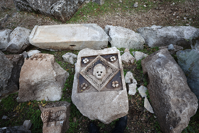 "Anıt mezar büyük bir podyuma sahip. Podyumun 4 tarafında da kalkan, mızrak, kılıç, zırh ve baltalar gibi silah kabartmaları görünüyor. Bu silahların bir kısmı kendi dönemlerinde kullanılan bir kısmı da efsanevi düşmanlara ait silahlar. Bunların en önemlisi de amazon kadın savaşçılarına ait kalkan, balta kabartmaları...