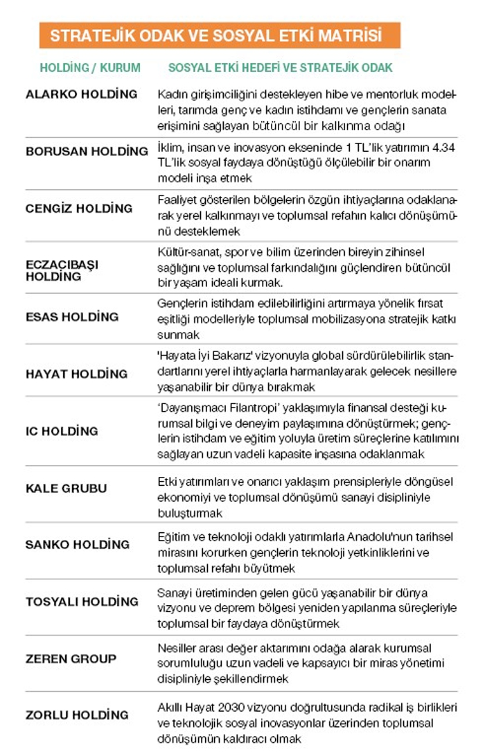 Küresel ölçekte sürdürülebilirlik kriterleri ve geleceğin iş dünyası eğilimleri sermayenin sadece finansal getirisine odaklanmak yerine toplumsal karşılığını da sorguluyor. Finansal kasların birbirine benzediği bir dünyada kurumları asıl ayıran güç toplumsal meselelere duyarlı yönetim modelleri ve bu duyarlılığı somut, ölçülebilir bir sonuca dönüştürebilme yeteneği oluyor. Sosyal sorumluluk sahası uzaktan izlenen durağan bir alan olma özelliğini yitirerek kurumun varoluş amacıyla bütünleşen ve geleceğe yön tayin eden canlı bir yapıya bürünüyor. Bu dosyamızda toplumsal yatırımın gelişimini, tekil projelerin ötesinde bir dönüşüm hikayesi olarak ele aldık. Bağış modelinden stratejik ortaklığa uzanan bu yolculuk; Türkiye Kurumsal Sorumluluk Derneği'nin (TSKD) kurumsal refleks analizinden Borusan Holding'in veri odaklı ölçümleme gücüne, Cengiz Holding'in yerel kalkınma odağından Eczacıbaşı Holding'in sanat ve kültür mirasına, Esas Holding'in fırsat eşitliği temelli toplumsal yatırım modelinden Hayat Holding'in sürdürülebilirlik vizyonuna, IC Holding'in bilgi ve deneyimi paylaşarak çoğaltan 'Dayanışmacı Filantropi' yaklaşımından Alarko Şirketler Topluluğu'nun 'anlamlı bir fark yaratma' odaklı stratejik yatırım modeline, Kale Grubu'nun onarıcı etki yatırımı yaklaşımından SANKO Holding'in teknoloji ile eğitimi buluşturan kapsayıcı değer üretimine, Zorlu Holding'in akıllı hayat zeminindeki yenilikçi odağından Zeren Group'un nesiller arası sorumluluk aktarımına kadar pek çok farklı perspektif sunuyor. Tosyalı Holding Yönetim Kurulu Başkanı Fuat Tosyalı ile bu çerçevede özel olarak bir araya geldik ve Tosyalı'nın yaşanabilir dünya vizyonu ile nasıl bir farkındalık inşa etmek istediği hakkında konuştuk. Toplum Gönüllüleri Vakfı (TOG) Orhan Karal'ın stratejik ortaklık kurgusu ise marka ve kurumlara çok daha dinamik bir yol haritası vaat ediyor.