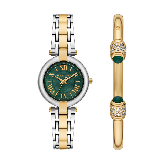 *Michael Kors Mini Laney hediye seti, saate eşlik eden bilekliğiyle Sevgililer Günü'nde şıklığı tamamlayan özel bir stil deneyimi sunuyor. İki tonlu tasarımı ve sofistike yeşil kadranıyla dikkat çeken 33 mm çapındaki saat ile yeşil taş detaylı kelepçe bilekliğin yer aldığı set, sevgiyi zarif bir hediyeye dönüştürüyor.