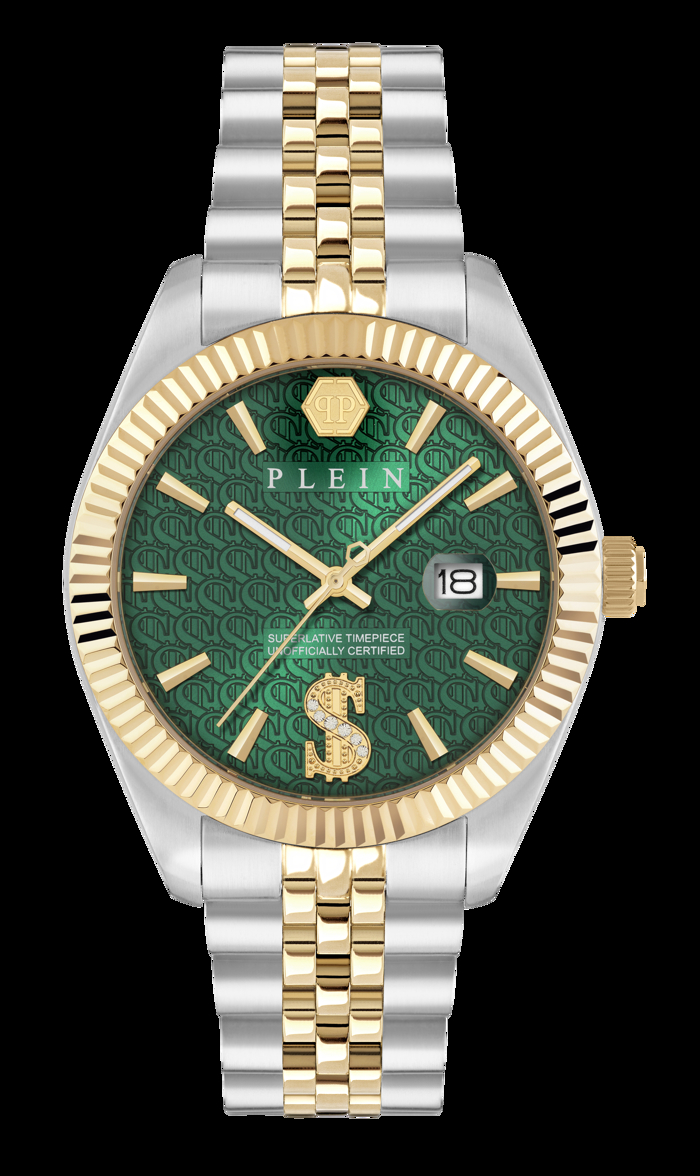 *Philipp Plein Superlative erkek saat modeli; 41 mm çaplı çelik kasası ve yeşil kadranıyla bilekte maskülen ve belirgin bir duruş sunarken altın ve metalik gri two-tone çelik bilezik tasarıma rafine ve modern bir görünüm katıyor. Philippe Plein Superlative ile Sevgililer Günü'nde aşka imzanızı atın.