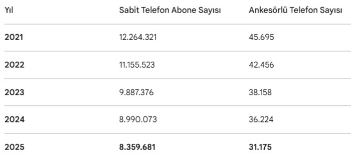 Türkiye'de 2014'te 12 milyon 445 bin 582, 2021 sonu itibarıyla 12 milyon 264 bin 321 olan ankesörlüler hariç sabit telefon abone sayısı, 10 milyonun altına indi. Bu sayı 5 yılda yüzde 32 azalarak 2025 sonunda 8 milyon 359 bin 681 olarak kayıtlara geçti.