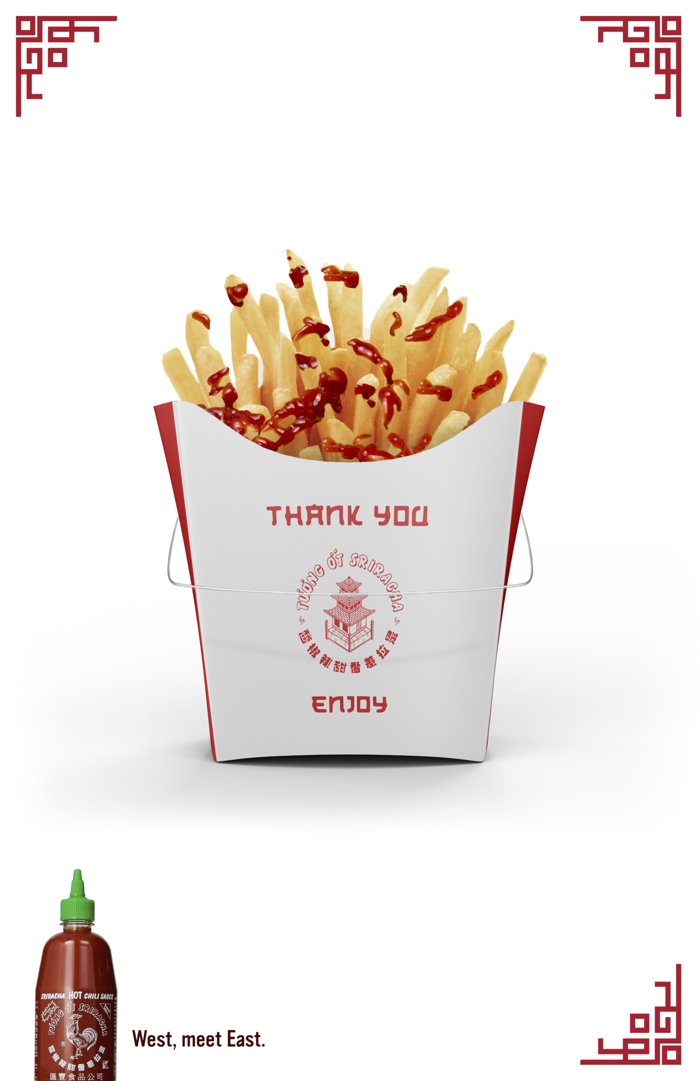 Doğu kökenli acı sos markası Sriracha, 'West, Meet East.' kampanyasıyla sadece yakıcılığını değil, aynı zamanda kültürel çeşitliliğini ve uyum yeteneğini vurguladı. Kampanyanın temel amacı, Sriracha'nın Batı mutfağındaki popüler yemeklerle ne kadar iyi eşleştiğini göstermek ve sosun en büyük kozunun 'acılık' olmadığı mesajını pekiştirmek. Bu kapsamda marka, Batı yemeklerini alıp ikonik Asya paket servis ambalajları içinde sunarak görsel bir tezat oluşturdu. Kampanya metni ise, meşhur 'Doğu Batı ile buluşuyor' ifadesini, sosun bu tanışmayı bizzat sağladığını vurgulayan 'Batı, Doğu ile Tanış' sloganına çevirerek bu alışılmadık lezzet birlikteliğini gözler önüne serdi.
